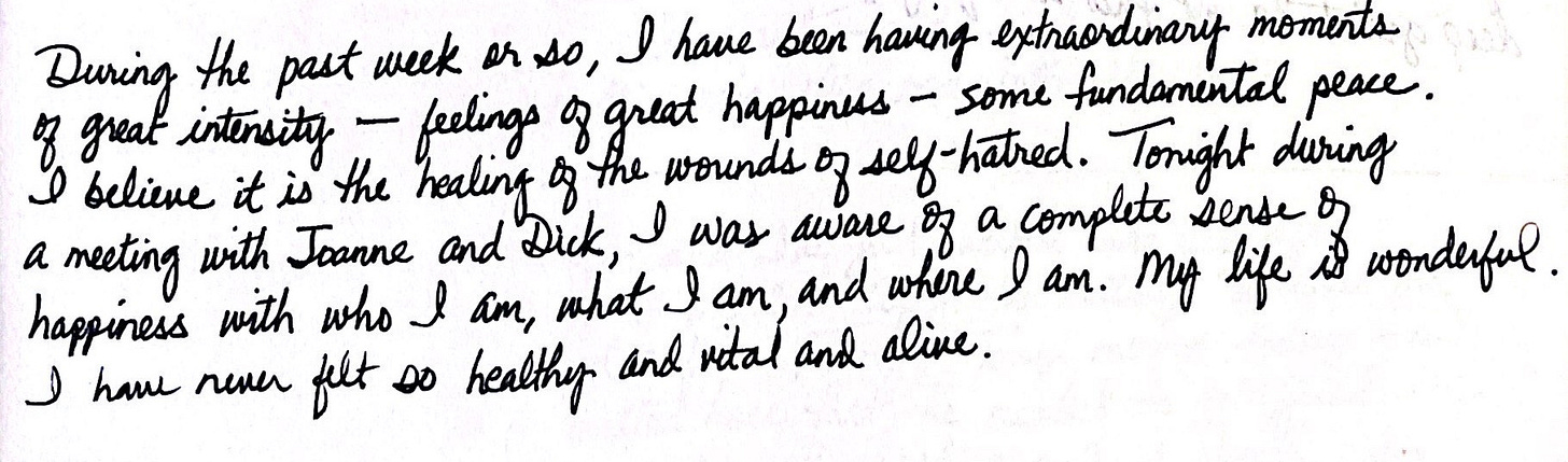 During the past week or so, I have been having extraordinary moments of great intensity— feelings of great happiness— some fundamental peace. I believe it is the healing of the wounds of self-hatred. Tonight during a meeting with Joanne and Dick, I was aware of a complete sense of happiness with who I am, what I am, and where I am. My life is wonderful. I have never felt so healthy and vital and alive.